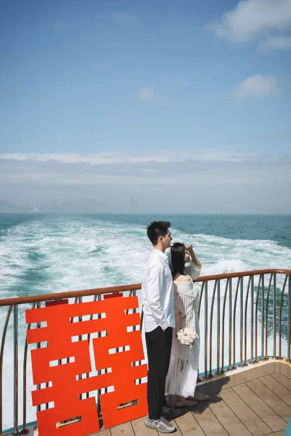 在海天一线的游轮美景里,享受独一无二的海上相爱之约。温馨提示,船上只是颁证仪式体验,不能登记结婚。船不等人,千万不要迟到哦~